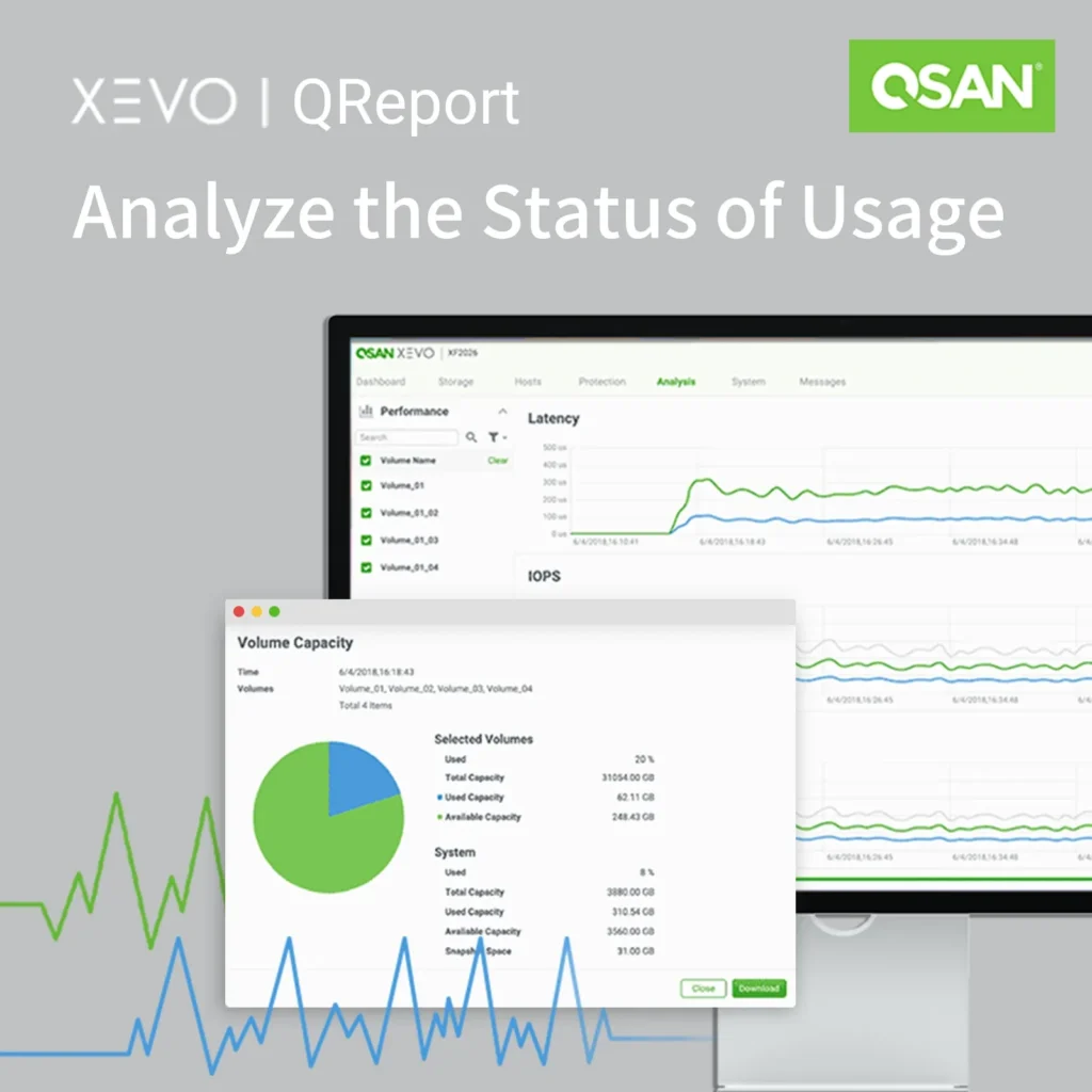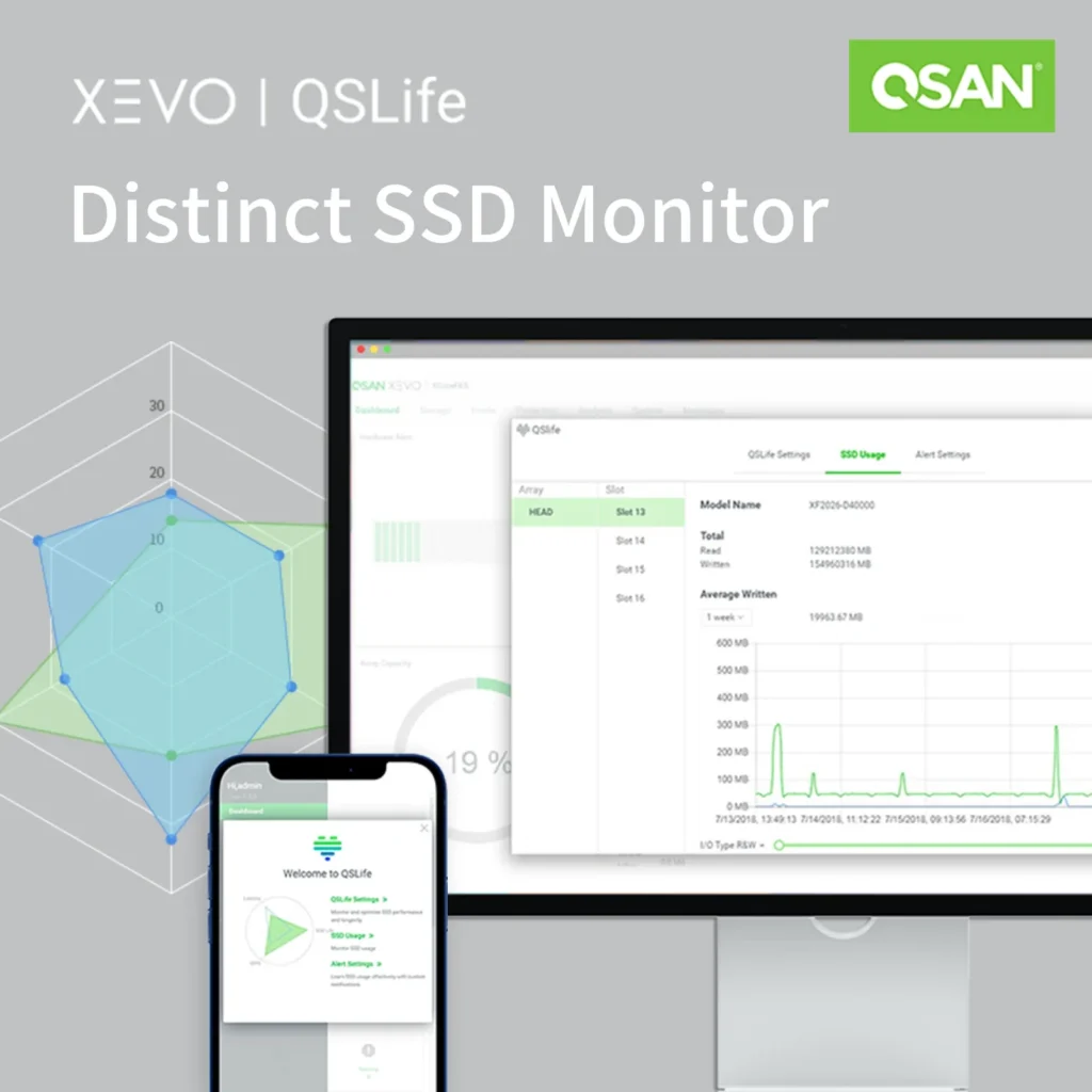 讀取密集型設計具有較低的 DWPD,通常建議作為開機設備使用:而寫入密集型設計具有更高的 DWPD,通常使用在關鍵型任務應用。了解了 SSD 的一些特性與適用環境後,俗話說的好,預防勝於治療,在享受效能優勢的同時又如何能大幅度降低硬碟損壞帶來資料遺失的損傷呢?QSAN 獨有的 QSLife 就是圍繞這個中心思想而設計的。例如,RAID 5 只能防止一個硬碟出現故障。如果在完全備份資料之前另一個磁盤發生故障,您將立即丟失所有資料。考慮到這一點,QSLife 隨時監控 SSD 健康度並分析、預測和提醒用戶 SSD 剩餘的壽命,讓您知道何時可能有資料損失的風險以立即使用新 SSD 替換舊有 SSD。 除此之外,QReport 通過私有域上的筆記本電腦、平板電腦、移動設備分析您的儲存的延遲、IOPS、Throughput,以生成為期一年的容量分析,通過綜合報告監控多個儲存卷和硬碟。